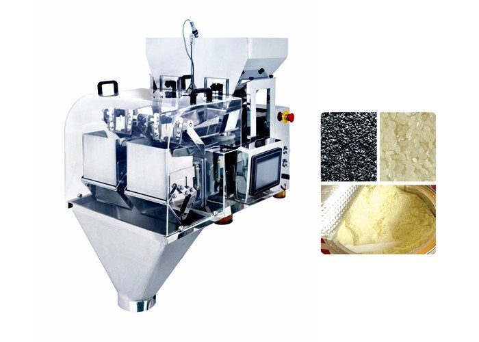 Il pesatore lineare capo 2 è adatto a pesare i piccoli prodotti della polvere o granulari quali i chicchi di caffè, la polvere del caffè, i dadi, gli anacardi, l'uva passa, il riso, la farina dello zucchero ed altri prodotti non alimentari e dell'alimento. I due saltatori separati su questa macchina possono essere riempiti con differenti prodotti per mescolarli con i pesi accurati. Secondo il prodotto, l'accuratezza di pesatura è fra 0.5g e 3g e può scaricare fra 20g e 3000g.